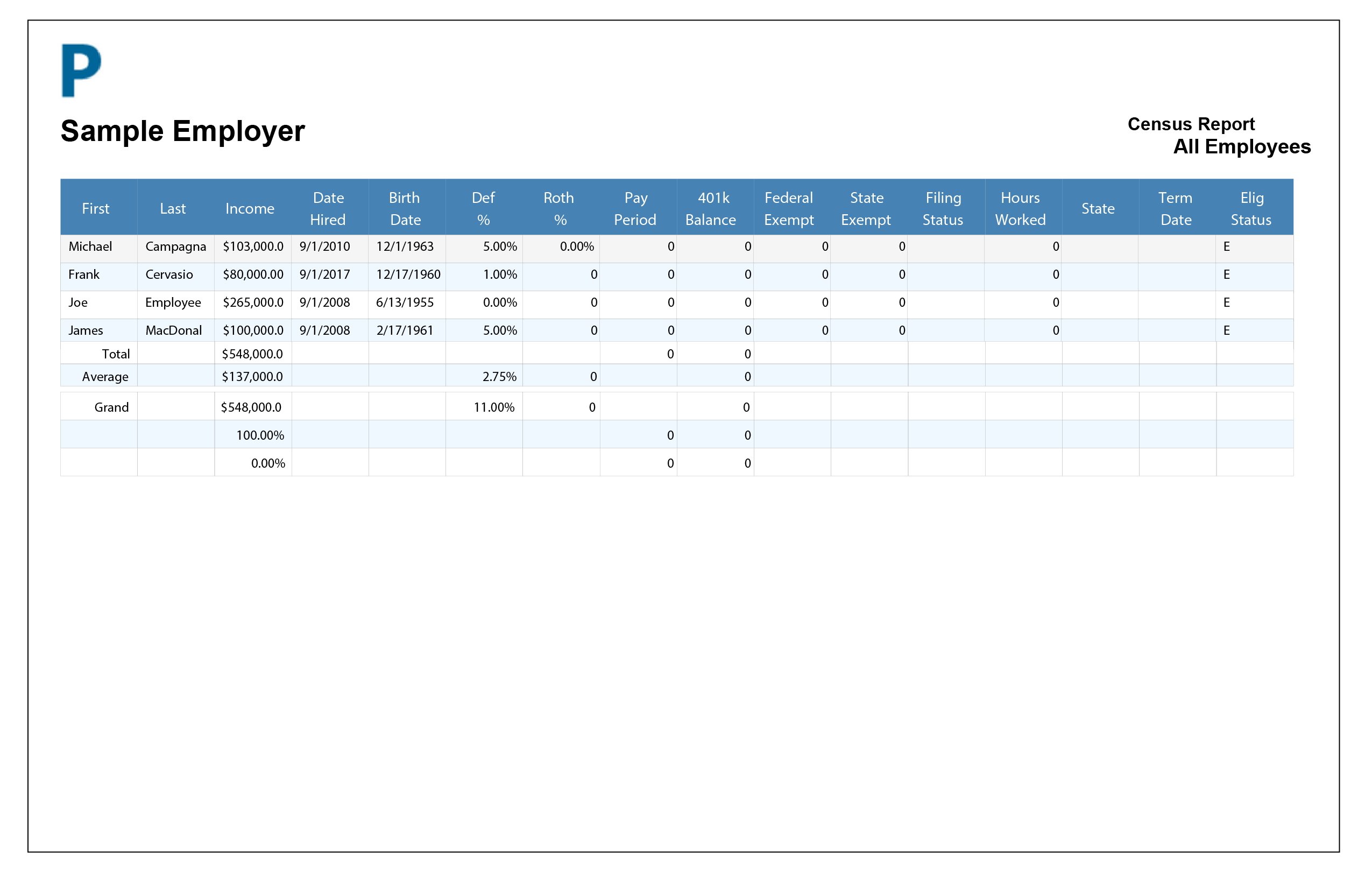 There are several options available to add employees to the system. Users can enter census data manually or import data from a csv, json or excel file.